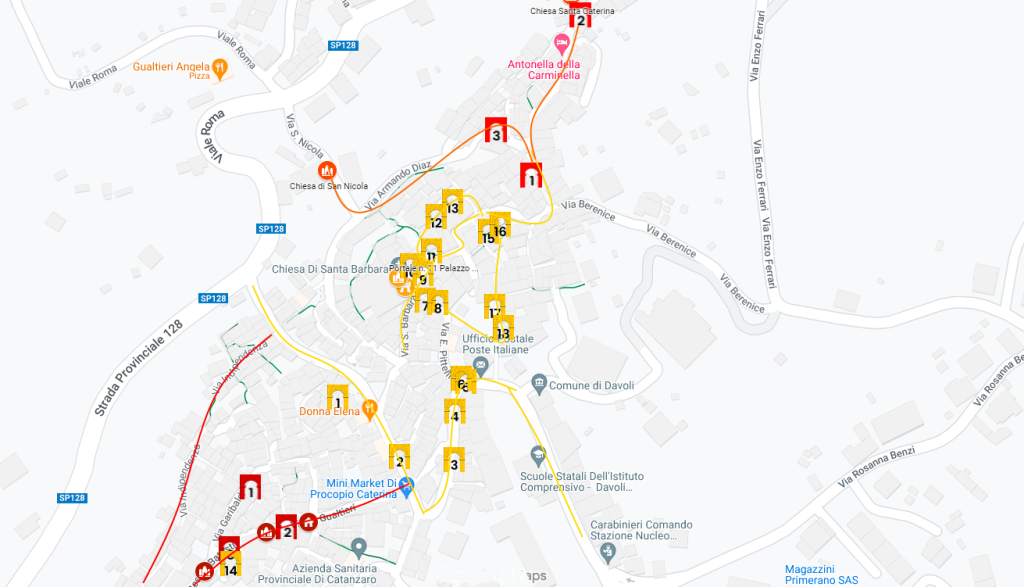 Davoli, extends along the sea line for a stretch of about 5 km, bordering on the right with the Ancinalesco torrent (right tributary of the Ancinale river) and on the left with the Melis torrent, which determine its natural borders to the north with the municipality of Satriano and to the south with the municipality of San Sostene. This territory rises in depth towards the mountain crest for about 30 km. The territory is made up of two large urban agglomerations, the historic center and the maritime center. The historic center, in a hilly area, 400 m. above sea level is developed on three increasing levels, from Santa Caterina, to Santa Barbara, to San Pietro, all protected by a natural basin surrounded by hills to the south and north with the mountain behind them, while to the east a natural window opens up that allows you to embrace the Gulf of Squillace.